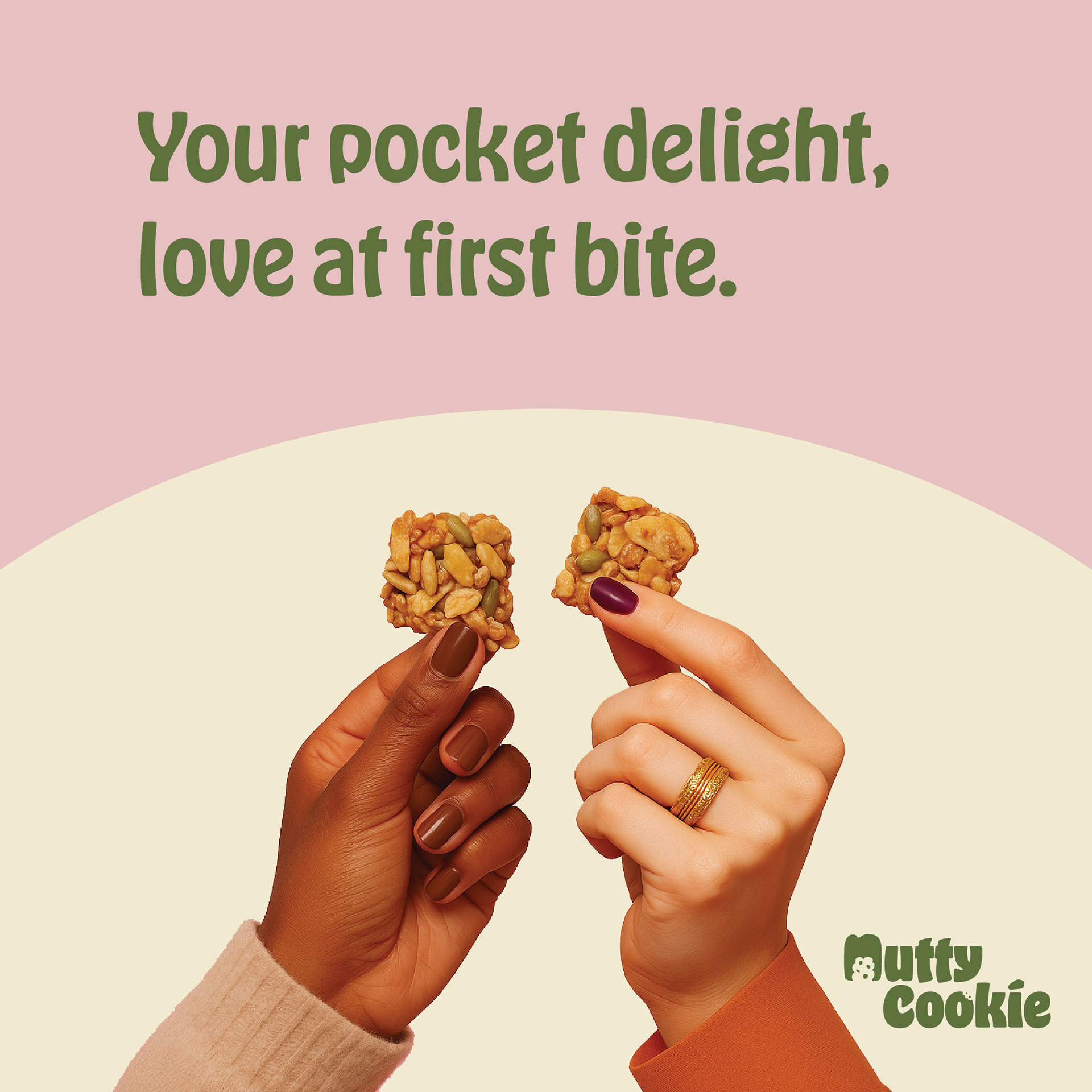 Nutty Cookie’s social media presence captures the same energy and friendliness as the brand itself. Bold typography, fun compositions, and vibrant color blocks keep the visuals eye-catching and shareable. Posts highlight product features, ingredient stories, and seasonal promotions in a way that feels authentic and engaging. The mix of lifestyle imagery and snack-focused visuals positions Nutty Cookie as both wholesome and fun, encouraging followers to not just purchase, but also connect with the brand story and community.