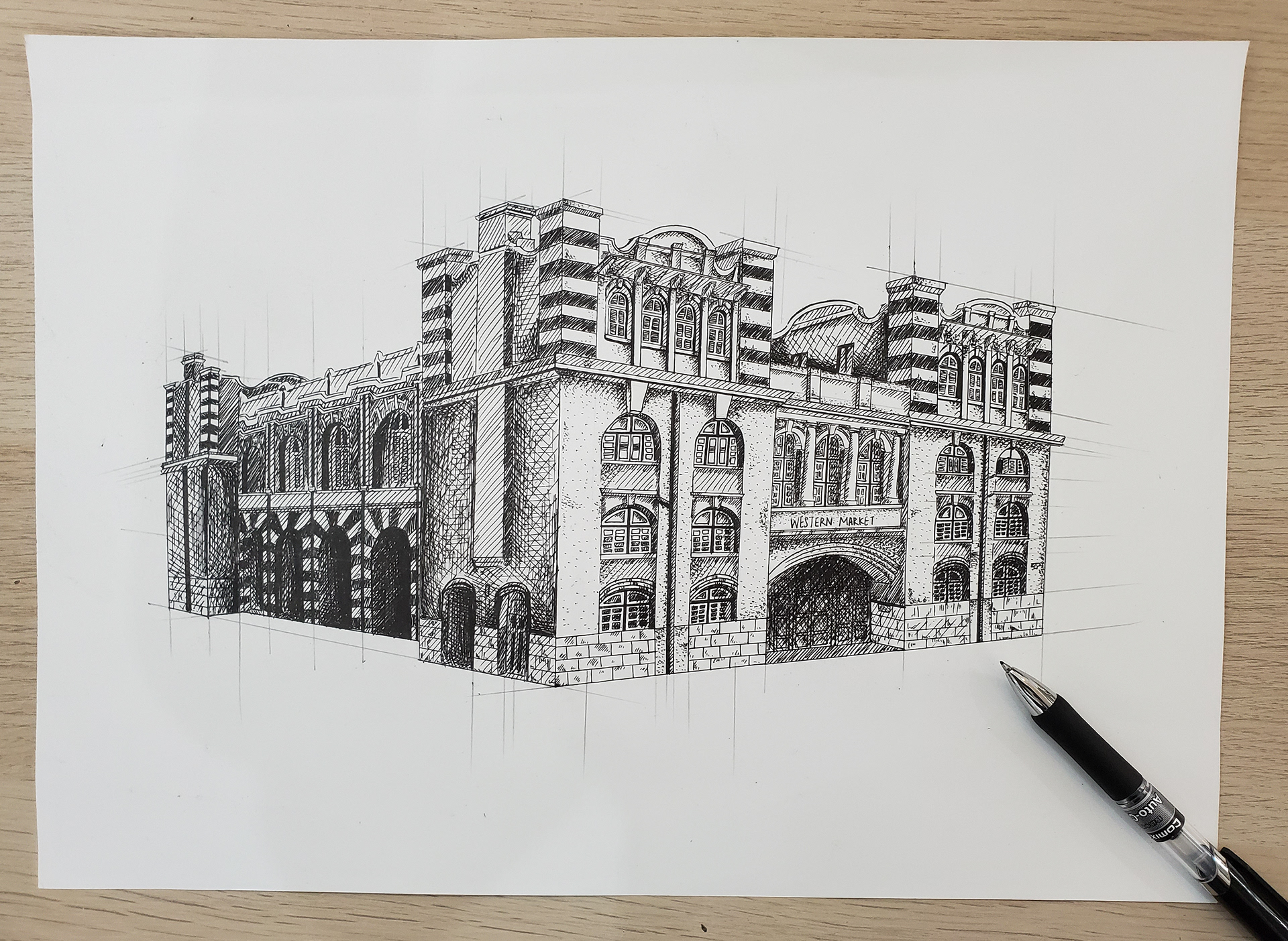 A detailed pen sketch of Western Market, a historical building in Hong Kong. This piece focuses on the architectural features and structure, capturing the charm and character of one of the city’s well-known landmarks.