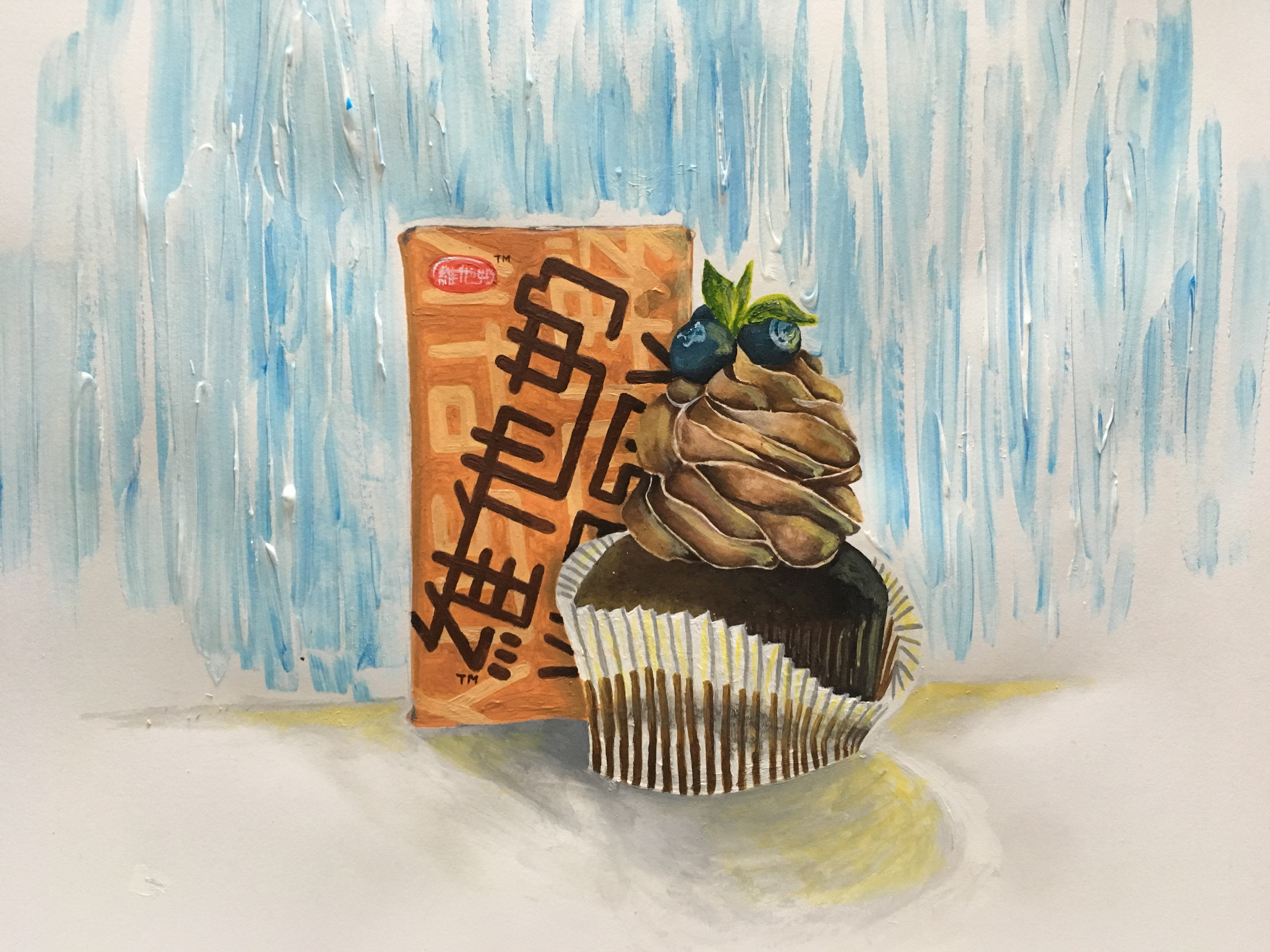 This painting was a practice in observation. I placed a box of Vita Malt Soy Milk next to a chocolate cupcake and painted what I saw. I wanted to improve my ability to see and show small details, such as light, shadow, and texture. The background was done using a palette knife to create a loose and cool-toned contrast to the warm colors of the objects. It was a helpful exercise in still life painting and a fun way to study two everyday items that have different surfaces and forms.